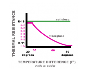 The thermal performance of cellulose insulation compares favorably to other types of low cost insulation. The thermal conductivity of loose-fill cellulose is approximately 40 mW/m·K (an R-value of 3.8 per inch). This doesn’t represent the whole picture of thermal performance. Other important aspects are how well the building envelope is sealed from air infiltration, convective airflows, and thermal bridging.